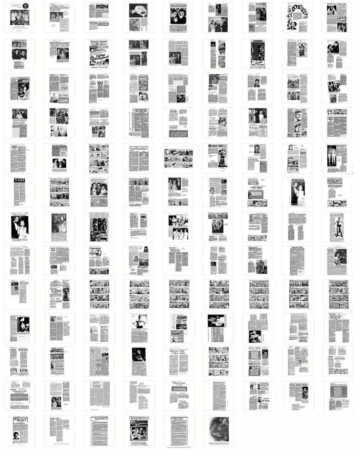 Over the 30 years I've collected newspaper articles and have assembled over 260 articles & news bits in 110 pages in one volume. This book covers the life of George Reeves as told in the newspapers. The image below will give you an idea what this volume contains. You will not find a more comprehensive volume of articles anywhere. These articles cover mainly George's theatrical and television career. If you are a fan of George, you're already educated in knowing much about his career from books and magazines. But with this book you can read first-hand the original articles that are snapshots of a career in progress. While you know all about George, this volume will offer many new surprises. It gives me great pleasure to make this available to you because I know there is a lot to offer in this book. You will have hours of reading. |