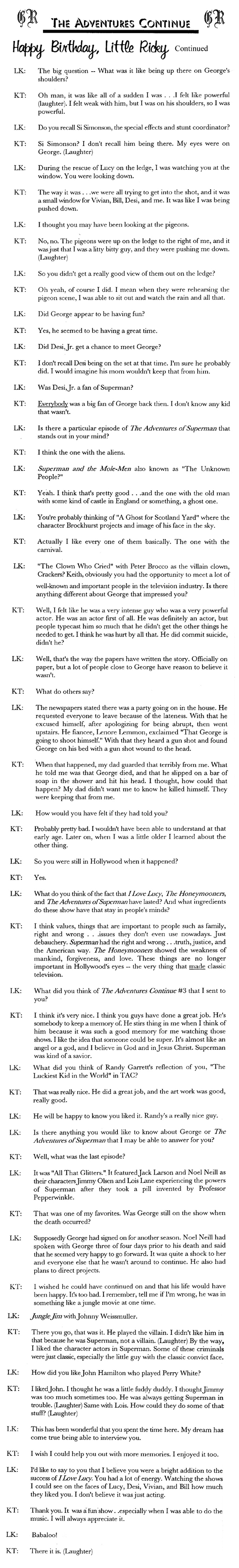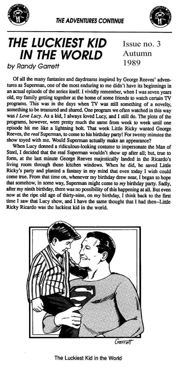 Swan's 60's Superman closely achieved that benchmark and my desire to see George's version continue onward in the comic book pages. I was appreciative of Mr. Swan's vision of Superman since this would be the best I was ever going to see. I often wondered why the publishers of DC Comics didn't incorporate George Reeves, who had a huge mass appeal and to many considered the definitive Superman. It seemed to me Mr. Swan would have little difficulty fine tuning his Superman with George in mind. But I suppose if there was a consideration the publisher would nix the idea for worry their revenue generating Superman would taper off if the readership had come accustomed to a certain look they were no longer getting when change became inevitable. Most likely this is a bit of stretch. But I'm sure it was much safer to keep the Superman model less dependent on any one actor. It also seems the logistic of Superman's all mighty powers wouldn't work on paper if rendered with the George Reeves look, whose struggle to save Lois and Jimmy kept viewers on the edge of their seats. As it should be. That is not to say, an actor's version wouldn't work in the comics. One only has to look at the Superman comics when in 2010 DC released Superman: Secret Origin and Gary Frank thrilled readers with his stylized version of Superman / Clark Kent presented in a Christopher Reeve fashion. Chris Reeve's Superman had the God-like powers much in accordance with the comic books. Below is a personal recollection from Randy Garrett as it was published by Jim Nolt in The Adventures Continue, Issue no. 3, released in the Autumn of 1989. With each issue to follow, you will find numerous illustrations by Randy Garrett. Randy would pay tribute to the classic and well loved episode of I Love Lucy, as well as consider Little Ricky Ricardo the luckiest kid in the world. |