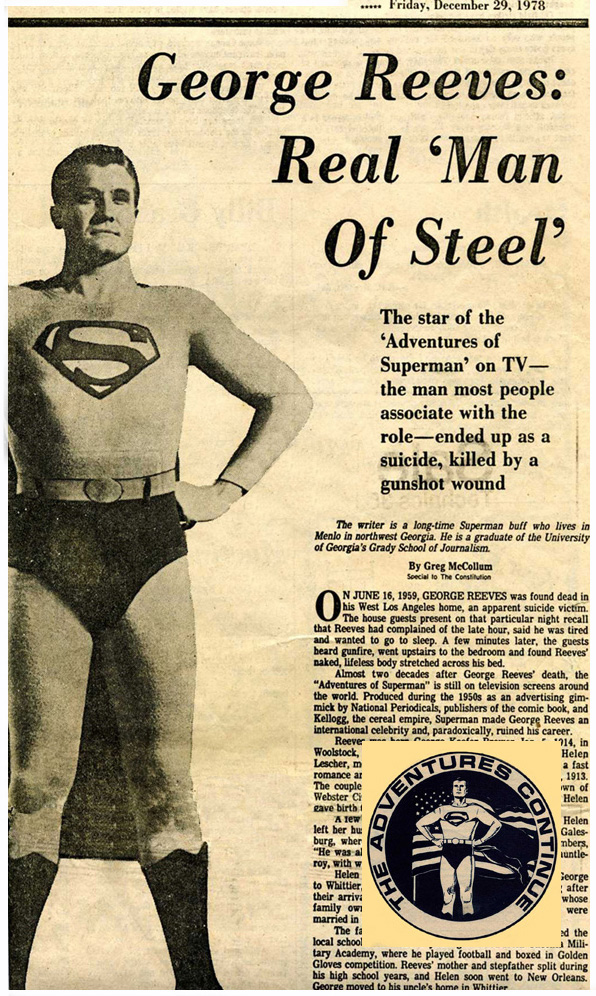 The feature being presented to you here holds significant importance, and therefore I respectfully ask for your patience in receiving this introduction. It was March 5, 2005 and I had just secured a newspaper article from an Ebay auction. At first glance, the Ebay auction description was vague at best and the image didn't give much to work with, with the exception of images including Helen and Don Brewer, as well as another of George Reeves as a small boy standing beside his step-father Frank Bessolo. The photo with George is similar to the photo Jim Nolt has provided at the Bessolo Family Photo Gallery. The image of Helen and Don is a rarity all in itself, perhaps because the two are together in the same photo. More than likely, other than the two images I figured this article wasn't going to reveal anything significant. I thought I'd take a chance anyway and hoped to be awarded this auction solely for wanting these two rare images. The article was dated December 29, 1978, one week after the release of Superman: The Movie starring Christopher Reeve. I've always been a George Reeves fan and the Adventures of Superman is my all-time favorite classic television show. I started collecting TAoS memorabilia with the Topps cards in the mid 60's. However, my learning about George started in the early 80's with a "by luck" purchase of Gary Grossman's book, Superman: Serial to Cereal. For a moment, let's rewind to the early days of Gary Grossman's 1976 book, SUPERMAN: Serial to Cereal. Thanks to Gary it was told George was not born Reeves, but Bessolo. But that's not to say Serial to Cereal offered ground breaking news. The Los Angeles Evening Herald, dated June 17, 1959 gave George's "real name" as George L. Bessolo. Gary's book went into numerous interesting details, yet it was obvious there was more to the entire story than covered in this book. Some of Gary's writings revealed not all was well with George during his last months. Aside from the usual reports of George being a "dejected star unable to find work," Whit Ellsworth would state "Two weeks (actually two months) before his death, George had a bad automobile accident and suffered a serious brain concussion. He was having violent headaches, and his doctor prescribed pain-killers. George had a little pain killer of his own--booze--and everybody knows that alcohol and sedatives make a very dangerous combination." The accident could have been nothing more than that, a stand-alone incident. Or perhaps it was related to his pattern of behavior stemming from a period involving a turbulent love triangle. I won't go into theories about the prescription drugs because a very radical comment will be offered within Greg's article. As far as I know the comment has never been repeated elsewhere, thus one of the many reasons I feel the article is unique, even to this day. In 1988, Don Rhoden of Nebraska published his first-two issues of a fanzine called The Adventures Continue. A wonderful beginning to what would follow. In his second issue, Don would provide his own article And Who Disguised As George Reeves He would surprise readers with never before insights to George's real name and who his real father was. It was for many, a major break-through in George's mysterious life and the start of more revealing insights that would take readers further into learning. Readers couldn't wait for the next issue of the Adventures Continue. The only complaint from a small number to the publisher was that the issues weren't released on a monthly basis. Not a bad complaint because the readership was extremely enthused about the subject. Unfortunately, some couldn't understand there was a limitation with readily available information and manpower. Time took care of the information, but manpower consisted of one. Both publishers, had day jobs during their respected issues. While it would be sensational to publish a monthly series about our favorite television show and it's leading man, Jim would be first to tell you the information just wasn't pouring in at a rapid fire rate to sustain a monthly fanzine. Remember, the first several issues were before the Internet came into public access bringing people closer. After 2001's issue no. 16, Jim realized the readership was below par and discontinued the hardcopy fanzine. For Jim it was never about a dollar margin. Throughout the entire 16 issue run, that never was the agenda, nor did it ever happen. It was about educating. Today, what remains is the very popular The Adventures Continue web-site with updated news and contributions. Since 1988, Jim's publication had become the corner-stone for all other work related to George Reeves, his life, film career, the highly popular television show the Adventures of Superman and the unfortunate and tragic death. Articles in REMEMBER, STARLOG, American Cinematographer and FILMFAX magazines (refer to the Paper Trail for listing), television segments such as Hollywood's Mysteries and Scandals, A&E Biography, Current Affair and Entertainment Tonight all turned to Jim in one form or another seeking information. I'll save us from going into more details. Especially since I'm eager to get you to the article. TAC gave Jan Alan Henderson proof a market did indeed exist for his own work-in-process book titled SPEEDING BULLET: The Life and Bizarre Death of George Reeves published in 1998. It can all be pointed back to1988, and 1976 before that with Superman: Serial to Cereal. |