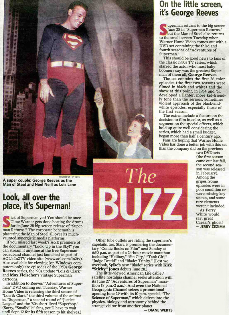 | This page is from NEWSDAY, June 18, 2006. There you will find many interesting DVD and broadcast items coming to Superman Fans of all kinds. Interesting article from Jerry Zezima regarding fans feelings towards the first two installments. Look no further than those fans who've discussed this issue at great length at Dave' Shutz's Friendly Adventures of Superman message-board. Lou (June 18, 2006) |