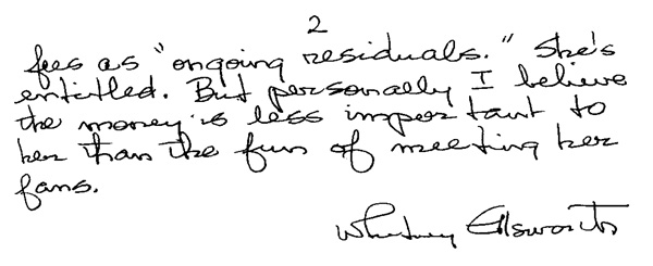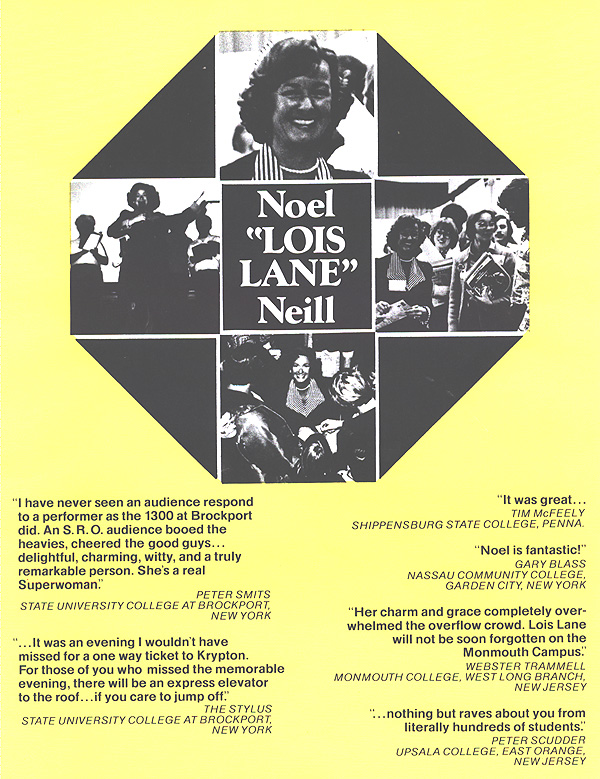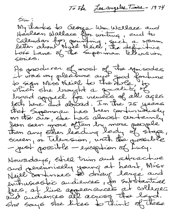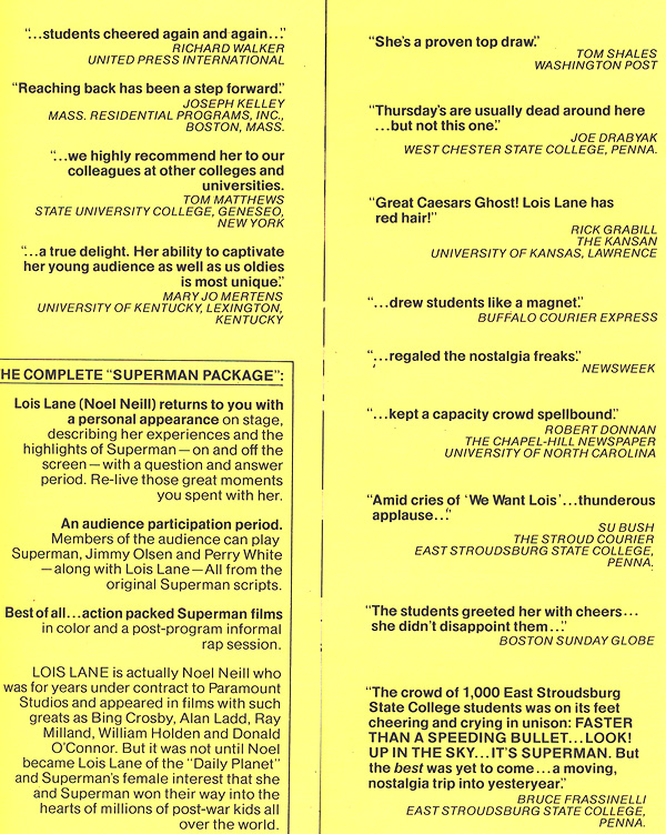 ![]() ![]() On page 87 of Truth, Justice, & The American Way: The Life and Times of Noel Neill, The Original Lois Lane, author Larry Thomas Ward references a letter written by producer Whitney Ellsworth to the Los Angeles Times in 1974. Here, in Noel Neill's filing cabinet, we can read that letter in its entirety. ![]() ![]() In 1974, Noel Neill was invited by "Jeff" to speak before the students at Monmouth College (New Jersey) about her career as Lois Lane. From Larry Ward's book: "The day of the event finally arrived. It was April 9, 1974, and I was nervous and unsure of myself. Jeff had orignally told me they expected not more than two-hundred people, at best. But when he picked me up at the hotel to drive me over to the campus, it was then that I learned that over a thousand students were waiting for me! The reception was totally unexpected and unbelievable. The film ("The Tomb of Zaharan") was run first and every time I was in a scene... the kids would just whoop and holler. Finally the film ended, and the room was completely dark. Someone handed me a microphone, and in my best 'Lois Lane' voice I shoulted, 'Gee, Superman, are we ever glad to see you!' The lights went up and I walked out on the stage and the place just erupted into booming applause, with the longest standing ovation I had ever witnessed. I was so overwhlemed by the moment that I began to cry. But the more I cried the more they applauded, so I knew I had to stop doing that. After several minutes everything calmed down and I grabbed the mic and began to talk about my years as 'Lois.' When I finished some twenty minutes later there was another standing ovation followed by a lengthy question and answer period. After that I spent an hour signing autographs. Those Monmouth kids were simply the best. The experience was one of the true highlights of my life." Second Drawer Third Drawer Fourth Drawer Miss Noel Neill |