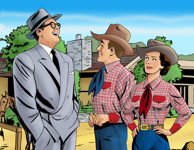 When the sun was still just a suggestion at horizon's edge the clatter of a cook's triangle and the slamming open of the bunkhouse doors, with cries from cowhands who had already risen and dressed, awoke the guests to the infant morning. Clark and Jimmy rose and took their turn with the others in their bunkhouse, using the one rest room. They were about to get in line with the others for chow when the cowhand from Virginia who had met them the day before called their names. "Mr. Cramer wants you and Miss Lane to have breakfast with him in his cabin." Several pairs of eyes from among the guests watched them as they followed the cowhand. There were a few murmurs about special treatment which they didn't hear. Lois was already out and waiting for them, and the three went to Cramer's cabin. Cramer was waiting for them. They went again to his small dining area and sat down to a huge breakfast of scrambled eggs, thick slices of ham, heavy biscuits the size of baseballs, and coffee so strong it could power a DC-10. Cramer finally sat back, satisfied. His plate was so clean one would think he hadn't had anything to eat. But Clark had marveled at the heaps of eggs, two big slices of ham, and half dozen biscuits their host had consumed. Cramer was of an average build, no significant trace of fat on him. The ranch life must work off all he ate. Cramer patted his stomach with both palms. "Well, let's say we walk off our breakfast. I want to take you around the place. Show you the mines, too." "The Lost Dutchman Mine?" Jimmy asked. Cramer chuckled. "Son, no one knows where that is. But a lotta folks have tried to find it. There's one particularly big project going on I want to show you about. If anybody has a chance of finding the Dutchman's mine, I guess they do." Cramer took them around back where a Jeep was waiting. "Perry didn't tell me if any of you could ride, so I thought we'd go around in this." Jimmy was excited at seeing it. "Jeepers. Is this just like the ones the soldiers used in the war?" "That's right, young man," Cramer said. "And you'd be surprised how much modern ranching is done now in vehicles like this." Jimmy was disappointed. "I was hoping to ride one of the horses in the corral." "You'll get your chance," Cramer said. "That's right," said Clark. "Remember, Jim, we're here on assignment; not a vacation." "It's a big spread," Cramer said, "especially since we're going out to the mines. So we'll ride some and walk some." They piled into the Jeep, Jimmy crying shotgun this time, and Lois and Clark sat in the back. Cramer showed them the fields that were set aside for a garden, raising the few vegetables that grew in the arid soil. Cramer parked the Jeep and they walked around the area as he pointed out points of interest. Man-made irrigation helped keep the field moist, and several hardy plants raised themselves proudly, displaying their fruit. Next were the cattle lands, where the herd grazed and fatted themselves, some serving to feed the visitors to the ranch and others to be led to town in the cattle drive that climaxed the regular two-week stay of the dude ranch hands. Again they parked the Jeep and walked, as the motor noise might have stampeded the animals. One of the cows stared directly at Lois as it chewed its cud. "Go ahead, Miss Lane," Cramer encouraged her. Lois gingerly approached the cow, which seemed to be waiting for her. She put out a hand and stroked an ear. It sighed a contented "moo." "You've made a friend, Lois," Clark teased. "I've always had a way with animals," she said. She came back, dusting her hands together. They walked around the herd a bit more before returning to the Jeep. The land was large, and stretched pretty far. Cramer told the joke about the Texas rancher who went east and was bragging about the size of his ranch. When asked whereabouts in Texas was his ranch, the rancher replied: "Son, my ranch isn't in Texas; Texas is on my ranch." The Jeep was approaching the hills, and Clark used his Telescopic Vision to search the foothills. He saw several mines, most placed a good deal apart, but several clustered close together. Most of them seemed to be run by two or three men each. One, however, had a crew of a score or so of men working it. Some were lounging outside as the other shift worked in the tunnels. It was toward this camp that Cramer now steered the Jeep. They walked the rest of the way to the site. A bullet-headed man had his hat off and was wiping his brow with a large bandana. He peered narrowly at the four visitors coming toward him. His scowl said he didn't like company, and it spoke correctly. Cramer led his guests right up to him. "Drake, this is Mr. Kent, Miss Lane, and Mr. Olsen. They're staying at the ranch." Drake replaced his hat and stuffed his bandana in a pocket of his plaid shirt. The squint through which he studied them wasn't caused by the bright sun. "You don't usually bring your dudes out here for a visit," he said. "What gives?" "Oh, these are special guests," Cramer said. "A friend of mine from back east sent them here." Clark decided to test the waters. "Actually, Mr. Drake, we're reporters." "Reporters?" "Yes. We're here to do a story on Mr. Cramer's ranch." Drake stepped a little closer to Clark. "Are you sure that's all you're here for?" Clark flinched only a little, for Lois' sake. "Well, we also hear there's been some mysterious deaths around here." He added innocently, "You wouldn't know anything about it that we could use in our story, would you?" "I got nothin' to say to no nosy reporters," Cramer growled. A second man who seemed a smaller edition of his boss came up. "Trouble, boss?" he asked, eying the four. "Nothin' I can't handle, Jonesy," he said. "Cramer, I thought we had an agreement. I don't mess with your business as long as you don't mess in mine." Cramer stood up to him. "I'm just giving them a tour of the country," he said. "They were interested in the Lost Dutchman Mine, so I thought I'd show the