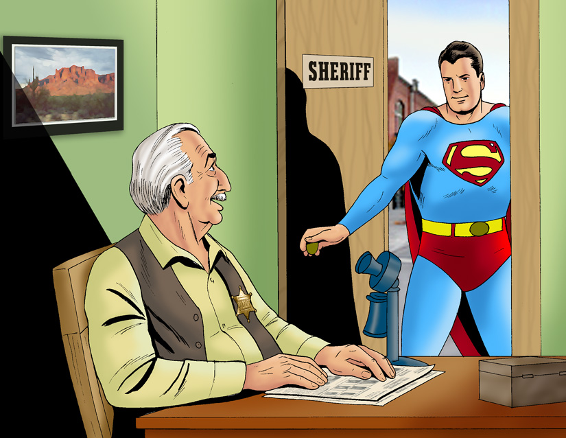 said. "Maybe I can find out "Good idea," agreed Clark. "I think I'll do some scouting around myself." "You want to come with me, Jimmy?" Lois asked. "No, I don't think so." Clark was worried a moment that his young friend would want to come with him. But then he saw a certain rider lead her horse from the stable and swing into the saddle. As she trotted her horse toward the ranch gate he smiled. "I think I'll get a horse and take a ride," Jimmy said. "After all, it's a dude ranch, isn't it?" "Have fun, Jimmy," Clark said, giving him an encouraging shove. He and Lois exchanged grins at Jimmy's enthusiastic jog to the stables. "I think Jimmy's got it bad this time," he said. "Looks like," Lois said. She saw a group of guests headed for a roping exhibition and started after them to catch up. Clark was left alone. He looked about him and walked slowly at first, and then with purpose as he neared some rocks. As he ducked behind them he removed his glasses and loosened his tie. * * * Sheriff Mason was a tall rangy fellow who had looked sixty even when he was only forty. Thinning gray hair and a thick white handlebar of a moustache made him look every bit the seasoned range rider he had always been. He sat at his desk in his office, his heavy brows knitted in thought. Usually his job was little more than breaking up the occasional bar fight, or jailing someone for drunk and disorderly. Those miners, especially the ones in that Drake outfit, could get mighty rowdy. But now there were two mysterious deaths to investigate: deaths that the coroner had ruled as murder, but with no visible cause of death. And no clue as to the killer. A whoosh and a thud outside his office caught his attention. He heard boots tread the boardwalk in front of his office. There was nothing unusual about that; but there was something unusual about the owner of this particular pair of red boots. His muscular frame was clothed in tight-fitting royal blue, and a scarlet cape hung from his shoulders. He knew immediately who this had to be. "Superman!" ![]() "Yes. Are you the sheriff?" asked the Man of Tomorrow in the deeper voice he used for his costumed persona. Mason rose. "Yeah, that's me. I never thought I'd ever meet you." He extended his hand, which Superman shook with controlled firmness. The sheriff sighed. "And boy, could I use your help." "I heard about the ghost sightings in Metropolis," Superman said, "and my curiosity was aroused. And now two men have been murdered, and I'm sure it wasn't done by a ghost." "I don't think so either, but there isn't a mark on either of the men and no trace of poison in their bodies. Their death is a mystery." "A mystery I'd like to help you solve," offered Superman. "Like I said, I can use all the help I can get." Mason shook his head and cast his eyes down. They seemed to see something far distant from the oaken floor of his office. "If I didn't know better than to believe in such things," he mused, "I'd say myself that they were killed by a ghost." * * * Ramona was already way ahead when Jimmy had passed the gate and left the ranch, but he could see her figure in the distance and urged his horse to follow. She was headed for the hills, and it seemed to him she might even be headed for the mines. He wondered what business she might have with the miners. Especially that Drake crew. He hoped she wasn't going there. She came to a hill near the mines and started her horse upward. He seemed to know the way, and Jimmy deduced that she had evidently done this before. As she reached the summit he came to the base and with some prodding and encouragement he got his own mount to climb the hill. Ramona was waiting for him, and spun about to face him, drawing a gun from a side holster as she did. She leveled it at him, recognized him, and eased the already cocked hammer forward. "Oh, it's you." Jimmy saw nothing but the bore of the .45 Colt she still held steadily. "The view is really something up here, isn't it?" he managed. "Why did you follow me?" Her manner was far from friendly. "I thought if I caught up to you we might ride back together." She looked him over. "I didn't think you could ride that well." She lowered the gun, holding it at her side. "I should have given you more credit." Jimmy relaxed a little now that he wasn't covered. He noticed for the first time the binoculars hanging from their strap around her neck. She must have been looking at something down at the mine. He wondered what it might be. "I had an uncle who owned a horse farm. He gave me riding lessons when I was twelve. I guess it's something you don't forget." Ramona turned toward the mines, which they could see from the vantage point of the hill. "Even so," she said, still looking down at the mine, "riding in the hills around here can be dangerous." "Then I'm here to protect you," Jimmy said. Then he grinned. "Of course, you're the one with the gun. Do you know how to use it?" Ramona studied him a moment, then indicated the single tree on the hill. "Do you see that knothole?" Jimmy could barely see it but said, "Yes." She drilled it with one shot. Then she tossed it to Jimmy. He caught it awkwardly and fumbled with it. It was a lot heavier than he thought it would be. "I never shot one of these in my life." He handed it back to her, afraid it might accidentally go off. She took her Peacemaker and holstered it. She actually smiled at him, for the first time. "So maybe I'll have to protect you." She went over to the tree and fingered the hole her slug had made. Her back to him, she also surreptitiously brushed a narrow notch in one of the branches. Jimmy thought she might actually be looking for something else. She crouched low and went to the edge of the hill, looking one last time through the binoculars at the mine. Then she backed away from the edge and rose, saying: "Come. It's time we went back." * * * Drake lifted his head sharply at the sound of the shot. Kendall and Jonesy were with him, and had heard it as 