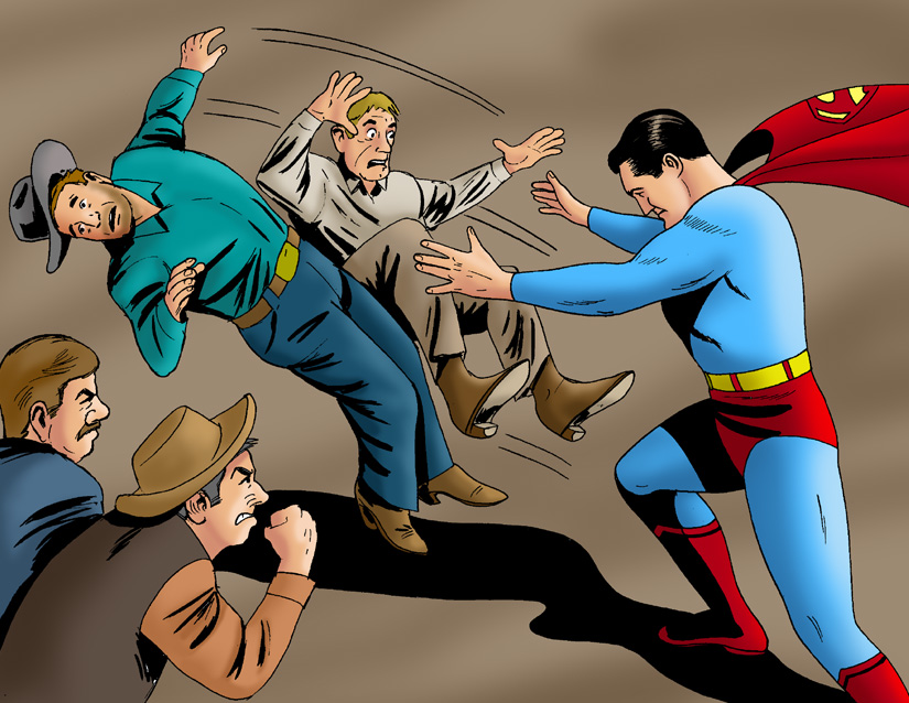It was a situation they had faced many times before: Lois and Jimmy were tied up, and someone was preparing a cluster of dynamite sticks to blow them up. This time, however, they were not alone. A third man, whom they had recognized as one of Drake's crew, was tied beside them. Jimmy wondered what the man had done to get him in trouble with his boss, but he decided now was not the time to ask. Drake and Kendall were training their revolvers on them while Jonesy and a few others were preparing the dynamite bundle that was wedged in the wall just behind the captives. They set the fuses and started trailing out the line. They fed it from a coil. It was obvious they were going to make sure there was a long distance between themselves and the explosion. "Soon," Drake said, his smile displaying relish at the thought, "soon you'll join the others who were too nosy to live." Drake whispered something to Jonesy, they compared watches, and the latter went off. The others also sprinted out, trailing the line behind them. Drake gave a nod to Kendall and they followed. The three were left alone. Jimmy spoke up. "I know you're one of Drake's men. How did you get in trouble?" Burke strained at his bonds, to no avail. "It's because I'm really not one of them, and Drake figured it out." "What do you mean?" Lois asked. "My name's not really Burke. It's Gary Allen. I do investigative work, mostly undercover, for the Federal Government." "What were you investigating?" Lois said. "Just what's going on here?" The question was left unanswered as a strange moon-gray glow appeared out of a side tunnel. As it drew closer, they recognized it. "It's the ghost!" cried Jimmy. "They say people see him just before they... before they die!" The Ghost cackled to them in some foreign tongue, laughed hideously, and ran out of the tunnel like some crazed thing. Even without having seen the ghost, all three knew they had but a few moments left. * * * Drake and his men were upon a ridge several hundred yards from the mine. The line was connected to the blast box. All was ready. Drake checked his watch. It was time. The box rested on a rock, so it was easier to reach. He took the handles in his hands. * * * Jimmy's eyes grew wide. "Look!" The Ghost was running back, pursued by a second figure. They were nearly identical, save for the eerie glow of the Ghost. The second figure leaped on the Ghost, and the two went to the floor. They rolled, and the Ghost came on top. He swung a hard right, and his double struck back, nearly knocking him off. The double grappled and twisted, spilling him off entirely, and climbing on top of him. He swung a left and a right. "Gosh!" said Jimmy. "There's not one ghost, but two!" "Whoever they are," Allen said, "they're both doomed like us!" The fight continued, becoming more desperate on both sides. * * * Drake thrust down on the plunger. Nothing happened. One of his men checked the connections again, pronounced them all right, and drew the handle back up for his boss. Drake pushed it home again, even harder than before. Still there was no explosion. "I'll go check it out," Kendall said. A couple of others volunteered to join him, and they jogged down the hill toward the mine. "One of you fouled up," Drake accused, "and bungled the job. When I find out which one it was..." He gripped his revolver butt menacingly. "Don't blame your men, Drake," a voice announced with authority. All spun at the sound to see a mightily muscled figure, clad in deep blue, a shield upon his chest, and a scarlet cape riding the wind. "Superman!" cried Drake, as if no one knew. Two others came up behind the Man of Tomorrow: Craig Roberts and Ramona. They also looked like they meant business. Drake worried only a moment. His whole gang, nearly two dozen, was behind him. Even Superman couldn't handle that many at one time. "Rush 'em!" he ordered. Superman caught the first two, one in each hand, and threw them back at the others. The collision knocked several down. But these men were tough, and as they started to get up Superman waded into them. He knew when to use his Super Strength, and when to hold back. These men were traitors to his country, and in old West parlance, "needed killing"; but it was not a fate for him to give. He punched and pushed, chopped and tossed; but none would die at his hands. ![]() Some feared to tangle with Superman, and thought the two with him were better prey. Two men took on Craig Roberts, but the FBI man had plenty of training in hand-to-hand combat, and knocked the first one down just as the second came at him. He ducked the first swing of his second opponent, and landed an uppercut that lifted him and dropped him on the ground. By then the first traitor had regained his feet, and grabbed Roberts from behind, gripping both of his wrists and holding them tightly. The second man recovered slowly, but came back for vengeance. As the first man held Roberts, he shot a hard right into the agent's mid-section, doubling him over. He brought his fist back for a second blow but suddenly his arm was gripped from behind, and he felt himself flying through the air. He landed hard for the second time in as many minutes. He looked up to see the slim, seemingly harmless, Ramona standing over him, half crouched as though daring him to rise. He did, and charged her. She neatly side-stepped, chopping down with the edge of her hand, and he lost consciousness. Roberts meanwhile had freed himself, and was wearing out his opponent. One final punch sent him down and out. More came at them, and Ramona displayed skills in Oriental martial arts which were totally unknown to these American thugs. Roberts knew something of it as well, and between the two of them they put out of commission about half a dozen. Drake, the leader, had stayed back. He saw each of his men fall, heaps of them lying on the rocky ground. The biggest heap, of course, lay around Superman. But the others were bad to mess with as well. Superman was 