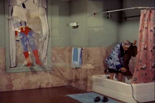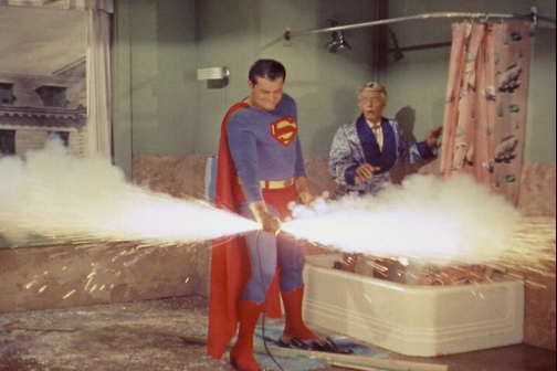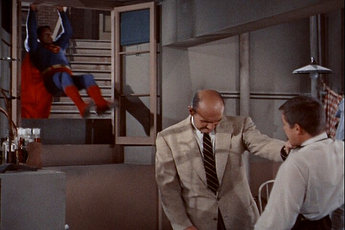 Still, there were a couple of bright moments. One of my favorite landings from the color years was in "The Phantom Ring" (1955), when Clark Kent was pushed out of the plane. Here, director Phil Ford kept the camera low, and had George jump from a relatively high perch. It worked wonderfully. ![]()