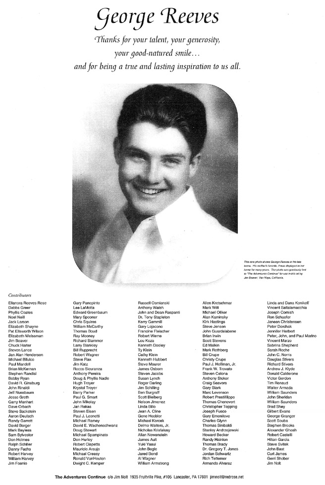 To celebrate the life of George Reeves and to show that he is remembered and admired even more than forty years after the last episode of the Adventures of Superman was filmed, the readers of The Adventures Continue placed the ad shown below in the June 1, 1999 issue of Daily Variety. Additionally, more than $1,000 was donated to the California Chapter of the Myasthenia Gravis Foundation in memory of George Reeves.On June 23, I received this letter of thanks from Lois Pedersen, Executive Director of the California Chapter of MG.